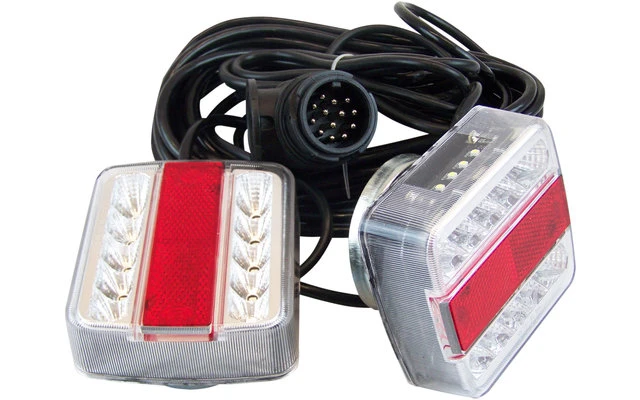 Juego de luces LED de cuatro funciones para remolques, con 2 piezas (intermitente, luz de freno, luz de matrícula) 2 x 5 filas de LEDs (matrícula = 4 LEDs), en óptica de vidrio transparente, carcasa soldada a prueba de agua, marcado e4, dimensiones aprox. Anchura x altura x profundidad = 10,5 x 10 x 3,5 cm, 12 V, utilizable a la derecha y a la izquierda, con cable intermedio de 2,5 m y cable de conexión de 7,5 m, enchufe de 13 polos, soporte magnético