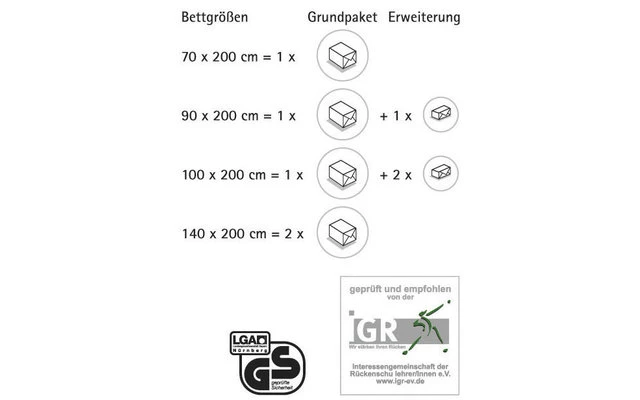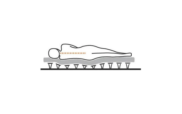 Los elementos de muelle se convierten en un cómodo somier. El sistema de descanso confort puede ser ajustado, medio o ancho seleccionando el espacio entre los agujeros. El grado de firmeza puede variar en consecuencia. El cuerpo se posiciona ortopédicamente de forma correcta y experimenta un apoyo individual y de alivio de la presión. Esto ayuda a evitar la tensión y el esfuerzo unilateral. Las celdas abiertas y permeables al aire garantizan una ventilación perfecta y un clima óptimo para dormir.