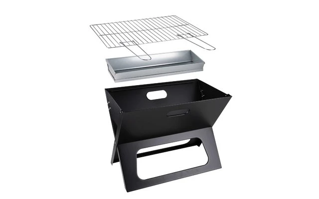 La parrilla se caracteriza por su moderno diseño negro. Este diseño triangular especial también hace que se mantenga firme sobre sus patas. Por supuesto, eso siempre es bueno cuando se trata de fuego y comida. La parrilla de mesa está equipada con un recipiente de fuego extraíble en el que se pone carbón o briquetas. La parrilla de acero inoxidable tiene asas extraíbles para no quemarse las manos. El despliegue es muy rápido y también se vuelve a plegar en poco tiempo.